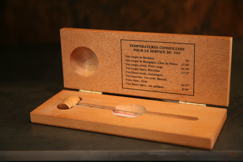 Sommeliérská sada. Teploměr na víno ve dřevěném pouzdru.